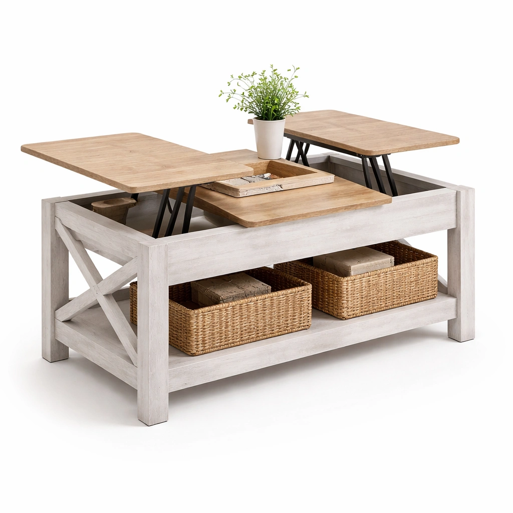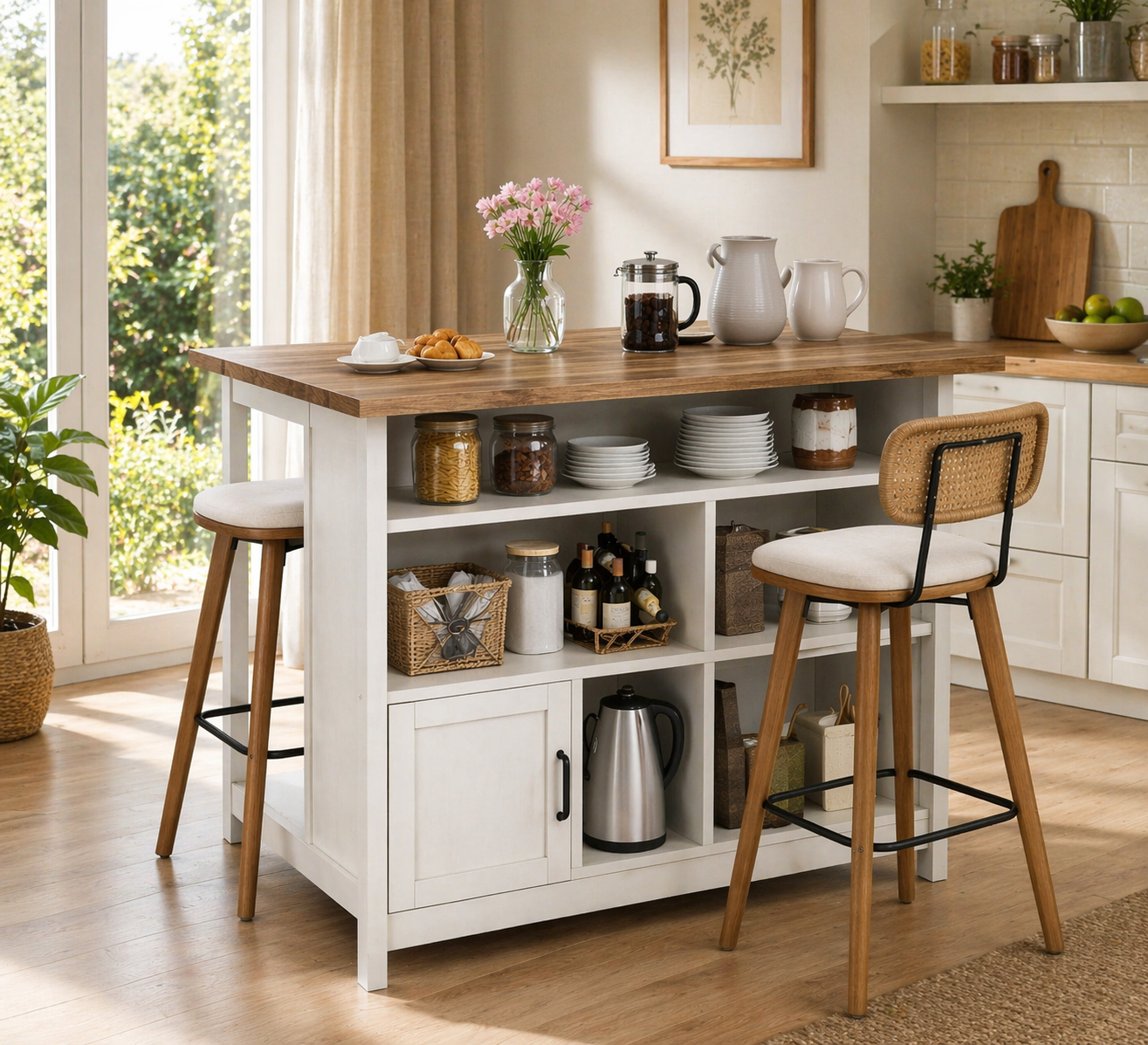 Offene Regale: zur Präsentation von Geschirr, Tassen und Dekorationen. Geschlossene Schränke: zur Aufbewahrung von Haushaltsgeräten oder anderen Gegenständen (für ein ordentlicheres Erscheinungsbild). Klar unterteilte Fächer für einfachen Zugriff. Arbeitsplatte aus Naturholz: warm und einladend. Weiße Schränke: sauber und hell. Passt mühelos zu verschiedenen Einrichtungsstilen.